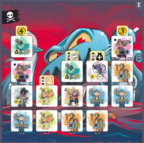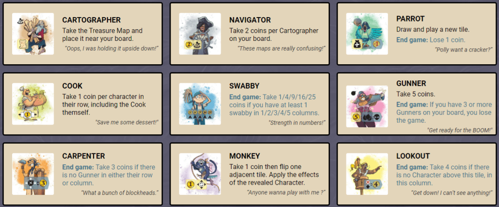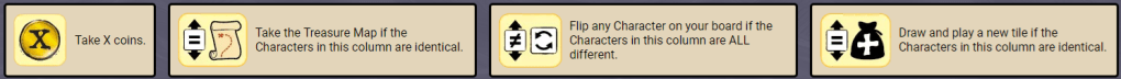 The core gameplay of Captain Flip is that you have a player board, with designated spaces for characters to be placed. On your turn, you draw a character, and you either place it in a column on your board, or you opt to flip it – hence Captain Flip – and then place in a column on your board. Characters must be placed from bottom to top in a column. Every character played affects your gold tally, either immediately, or at the end of the game, as well as having other abilities. That’s it. That’s the whole game.