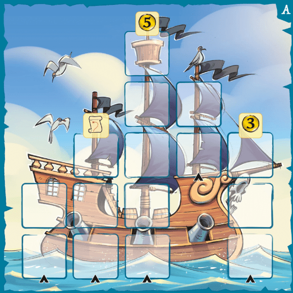 There is a treasure map that players compete over for ownership, which gives the owner one gold at the end of their turn. Once four columns are filled by any player, game end is triggered, and the round concludes so all players have had an equal number of turns. End game scoring is conducted, and the player with the most gold wins.