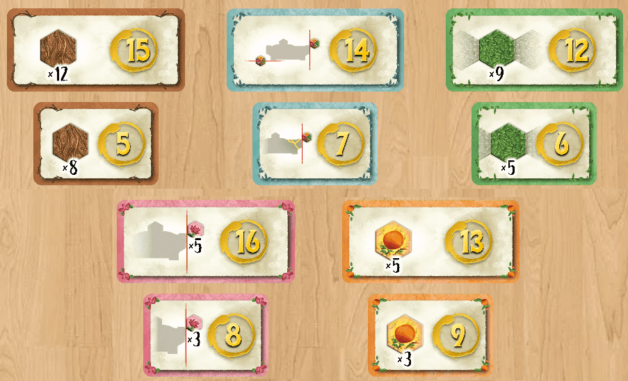 Finally, there are Parchment cards, which provide end game scoring for the possessing player for a specific condition. These exist for pretty much all tile and card types with the exception of tools.