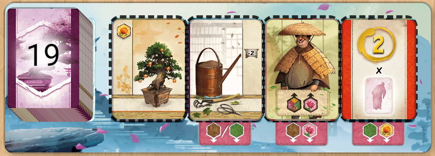 There are a few different types of cards available in the market. Growth cards get added to your Seishi, and allow you to place more of a given type of tile into your tree when you grow your tree. Tool cards also are added to your Seishi, and allow you to hold more tiles overall, with five being the starting limit.
