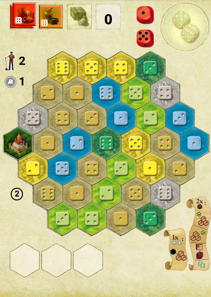 There are three “resources” available in the game. These are the two dice players roll each turn, workers, and silver coins. On a player’s turn, they roll their dice and use the numbers showing on them to acquire and place tiles, gain workers, or sell goods.